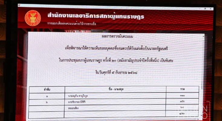 จากผลการโหวตเลือกนายกรัฐมนตรี ที่ทาง นายอนุทิน ชาญวีรกูล จากพรรคภูมิใจไทย ได้รับเสียงโหวตท่วมท้น นั่งนายกฯคนที่32ของไทย โดยที่ประชุมสภาฯ ได้ลงมติ ให้ความเห็นชอบนายอนุทิน เป็นนายกรัฐมนตรีคนที่32 ด้วยคะแนนเสียง 311 คะแน เกินกึ่งหนึ่งของเสียงทั้งหมดในสภาฯ ขณะที่ นาย ชัยเกษม นิติสิริ แคนดิเดตนายกรัฐมนตรีจากพรรคเพื่อไทย ได้ 152 คะแนน ซึ่งมีการงดออกเสียง 27 คะแนน