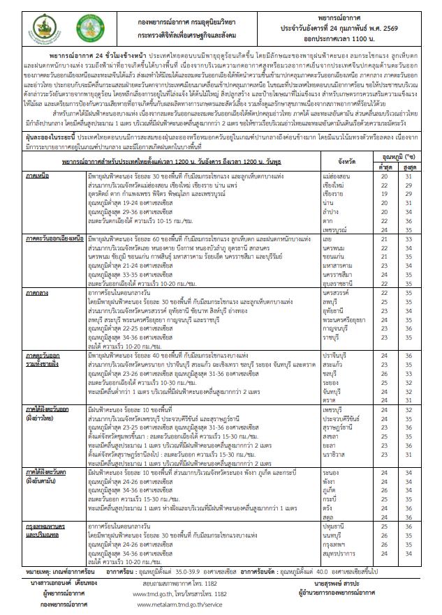 วันที่ 24 กุมภาพันธ์ 2569 กรมอุตุนิยมวิทยาประกาศเตือนพายุฤดูร้อนถล่มไทยตอนบน