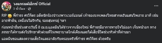 ด้านวงแกรนเอ็กซ์ ได้โพสต์ข้อความระบุว่า พี่กำธร ศรวิจิตร อดีตนักร้องนำวงพาวเวอร์แบนด์ เจ้าของบทเพลงไทยสากลอันไพเราะ อาทิ เช่น อายฟ้าดิน, เหมือนไม่รักกัน, รอยสุนทรภู่ ฯลฯ